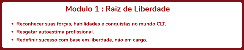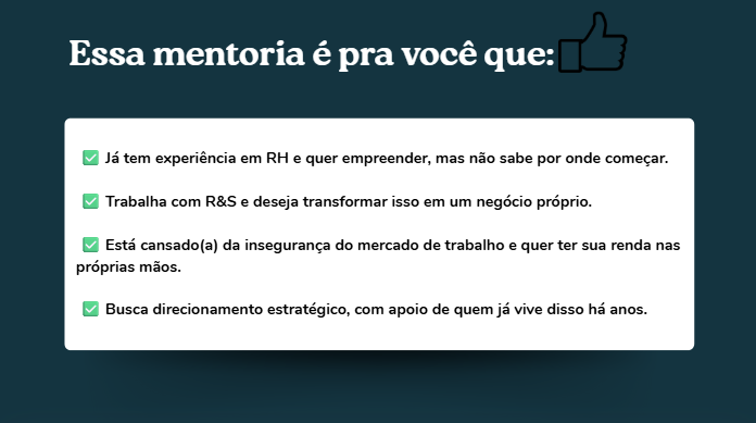 Por isso criei a Mentoria Protagonista RH, um passo a passo individual para você criar uma consultoria lucrativa, sem precisar largar o emprego, sem depender de indicação e sem se sentir uma "vendedora".