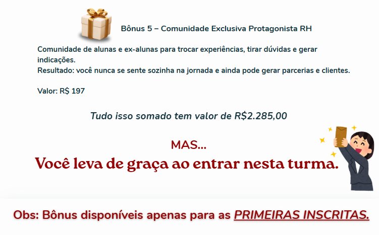 Por isso criei a Mentoria Protagonista RH, um passo a passo individual para você criar uma consultoria lucrativa, sem precisar largar o emprego, sem depender de indicação e sem se sentir uma "vendedora".